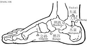 具有补阴作用的穴位中有三个穴位很常用,即太溪、三阴交和照海,太溪为肾经原穴,三阴交则是肝、脾、肾三经的交会穴,而照海通奇经八脉之阴跷脉,阴跷、阳跷脉左右成对,有“分主一身左右阴阳”之说。因此有学者认为,太溪补一经之阴(即肾经),三阴交补三经之阴(即足三阴经-肝经、脾经及肾经),而照海补六经之阴(手三阴经-心经、肺经、心包经和足三阴经-肝经、脾经、肾经)