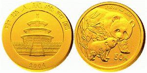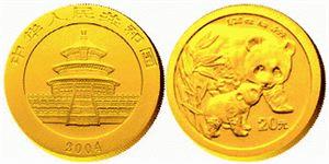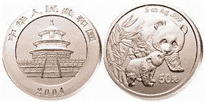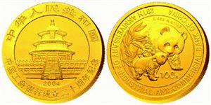 [ 14 ]: [2003]17 2003年12月18日发行2004版熊猫贵金属纪念币一套。 该套纪念币共13枚,其中金币7枚,银币4枚,铂币1枚,钯币1枚。 1.北京天坛祈年殿,并刊国名、年号/母子大熊猫图,并刊面额 1盎司金质纪念币为普制币,含纯金1盎司,成色99.9%,形状为圆形,直径32毫米,面额500元,发行量120000枚。