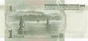 [ 40 ]: 背面主景图案为杭州西湖,左上方印有阿拉伯数字“1”,左下方印有面额“1YUAN”,右上方为“中国人民银行”汉语拼音和蒙、藏、维、壮四种民族文字的“中国人民银行”字样、面额,右下方为年号和“行长之章”印鉴。