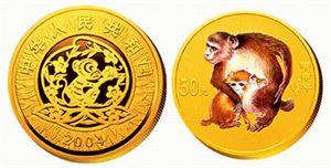 [ 3 ]: 2.中国民间剪纸猴装饰图案,并刊国名、年号/母子猴图,并刊面额 1/10盎司圆形金质彩色纪念币为精制币,含纯金1/10盎司,直径为18毫米,面额50元,成色99.9%,发行量30000枚