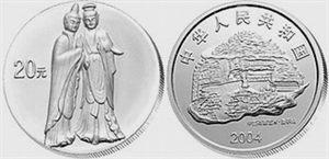 [ 38 ]: 3.2盎司银质纪念币背面图案为麦积山石窟二尊菩萨立像,并刊面额。 2盎司银质纪念币为精制币,含纯银2盎司,形状为圆形,直径40毫米,面额20元,成色99.9%,发行量20000枚。