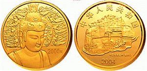 [ 37 ]: 2.5盎司金质纪念币背面图案为麦积山石窟坐佛像(局部)和飞天图案,并刊面额。 5盎司金质纪念币为精制币,含纯金5盎司,形状为圆形,直径60毫米,成色99.9%,面额2000元,发行量288枚。