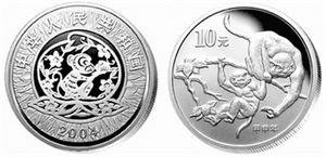 [ 7 ]: 7.中国民间剪纸猴装饰图案,并刊国名、年号/母子猴图,并刊面额 1盎司圆形银质纪念币为普制币,含纯银1盎司,直径40毫米,面额10元,成色99.9%,发行量80000枚。