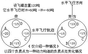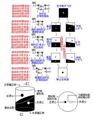 我们以下面这张图为根据制做了8种飞碟的飞行力学模型。每当研究飞碟向斜上方飞、做水平飞、向斜下方飞这三种飞行的具体情况,以及由此产生出其它的飞行变化时,都需要对这三个模型做俯视。然后才可以进一步考虑,飞碟船体中正负质心(即船体的两个正负受力点)的位置变动。而每当我们对这三个模型做俯视时,都有一种似曾相识的感觉。下面,我们只用飞碟做水平飞行时的模型做说明。该模型的制作如下: