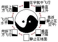 但是,这样画出的《八卦太极图》实在很麻烦。如果能用飞碟在它8种飞行时的8个时空记号,来代替上图中的8个飞碟船体物理模式,就得到了一个一模一样的《八卦太极图》。见下图: