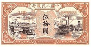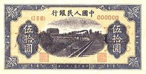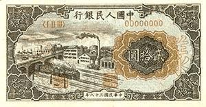 1949年1月,北平解放,中国人民银行总行迁到北京。全国解放后,各大区和盛自治区、直辖市中国人民银行相继成立。1951年底,除西藏自治区和台湾省外,全国范围内货币已经统一,人民币成为我国唯一的合法货币。到1953年12月,人民币发行券别有1元券、5元券、10元券、20元券、50元券、100元券、200元券、500元券、1000元券、5000元券、10000元券、50000元券等12种;版别共62种。其中,1元券2种、5元券4种、10元券4种、20元券7种、50元券7种、100元券10种、200元券5种、500元券6种、1000元券6种、5000元券5种、10000元券4种、50000元券2种。