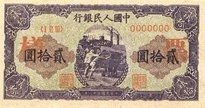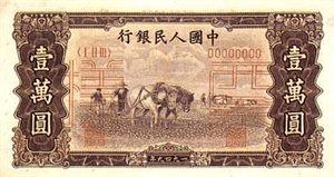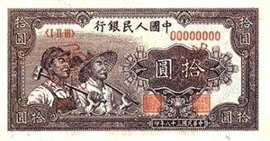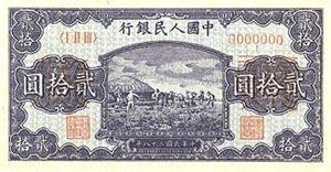 为了适应形势发展的需要,进一步统一解放区货币,经华北人民政府、山东人民政府、陕甘宁和晋绥两边区人民政府会商决定,合并华北解放区的华北银行、山东解放区的北海银行和西北解放区的西北农民银行,于1948年12月1日在河北省石家庄市成立中国人民银行。首任总经理南汉宸,副经理胡景云、关学文。同时开始发行统一的人民币,这是中国人民银行成立后发行的第一套人民币。第一套人民币上的“中国人民银行”六字由当时的华北人民政府主席董必武同志题写。第一批发行的人民币有10元、20元和50元三种券别,首先在华北、山东和西北三大解放区流通使用。随后发行了1元、5元和100元三种券别的人民币。此后,各种券别和版面的人民币逐步推广到全国各个解放区。