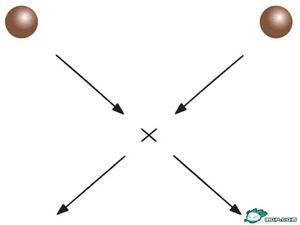 左上方的小球以匀速向右下方运动。一个相似的球,从右上方,同时以同样的向左下方速度运动。它们彼此在"x"处相遇。这时除非在两球于"x"处相汇时会产生相撞的声音那么你会感到一种运动。因此你理所当然地认为球相撞了,那么左上方出发的球向左下方运动而右上方出发的球向右下方运动。