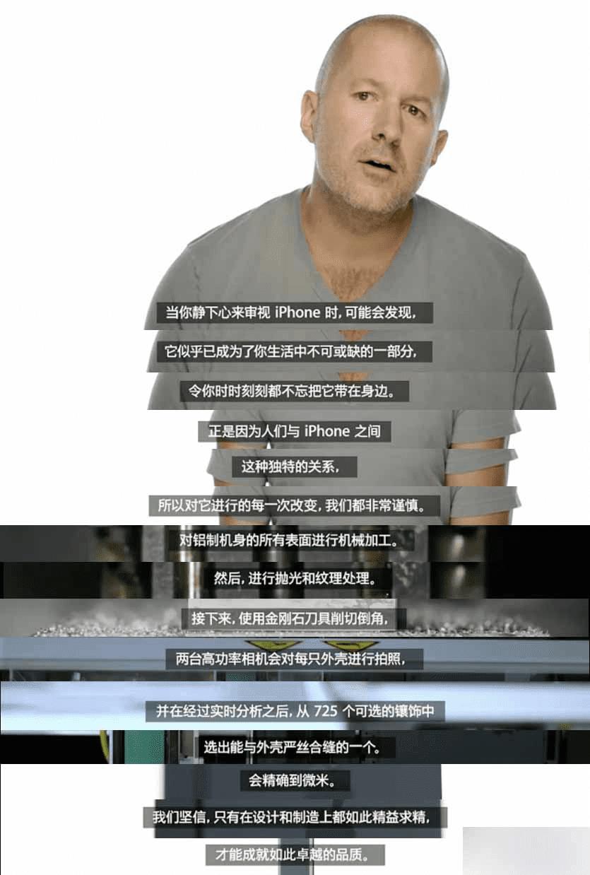 记得当时我有接触一些手机的工业设计工作,才知道那个时候CNC(精密机加工)、高速拍摄,是多么碉堡的创新,同行连想都不敢想的技术被苹果用在了手机制造商,可对用户来说,可能根本不了解,但通过这类专业的侵染,树立起苹果"专业权威"的形象,后几年国产手机才陆续提起这类产品制造工艺。