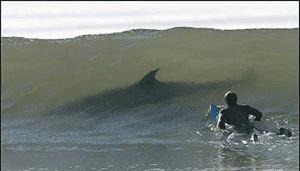 看到什么了???哇是一条鲨鱼也..和一个冲浪的人离得这么近.真的好危险哟..说不定当然这个人还没发现它..也说不现在哪个鲨鱼没饿……….真是汗`!~!