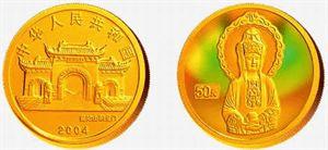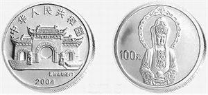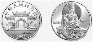 [ 78 ]: [2004]21 2004年12月28日发行2004年观音贵金属纪念币一套。该套纪念币共3枚,其中金质纪念币1枚,铂质纪念币1枚,银质纪念币1枚。 该套纪念币正面图案均为:普陀山朝圣门,并刊国名、年号及“普陀山朝圣门”中文字样。 背面图案 1/10盎司金质纪念币、1/10盎司铂质纪念币背面图案均为托钵“白衣观音像”,并刊面额。 1公斤银质纪念币背面图案为观音像,并刊面额。 1. 1/10盎司金质纪念币为精制币,含纯金1/10盎司,成色99.9%,形状为圆形,直径18毫米,面额50元,发行量33000枚。