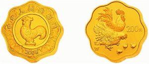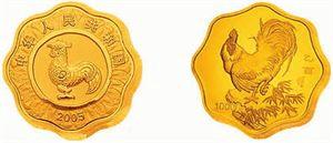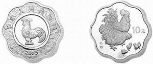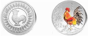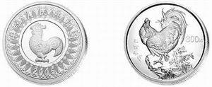 正面图案 以下10枚金银纪念币正面图案均为中国古代青铜器鸡形装饰及鸡冠花装饰图案,并刊国名、年号: 1/10盎司圆形金质纪念币 1/10盎司圆形金质彩色纪念币 1盎司圆形银质纪念币 1盎司圆形银质彩色纪念币 1公斤圆形银质纪念币 1/2盎司梅花形金质纪念币 1公斤梅花形金质纪念币1盎司梅花形银质纪念币 5盎司长方形金质纪念币 5盎司长方形银质纪念币 以下2枚金银纪念币正面图案同为长城居庸关风景,并刊国名、年号: 1/2盎司扇形金质纪念币 1盎司扇形银质纪念币 背面图案 以下4枚金银纪念币背面图案同为群鸡图,并刊面额: 1/10盎司圆形金质纪念币 1盎司圆形银质纪念币 1/2盎司梅花形金质纪念币 1盎司梅花形银质纪念币 以下2枚金银纪念币背面图案同为彩色雄鸡图,并刊面额: 1/10盎司圆形金质彩色纪念币 1盎司圆形银质彩色纪念币 以下2枚金银纪念币背面图案同为另一幅雄鸡图,并刊面额: 1公斤圆形银质纪念币 1公斤梅花形金质纪念币 以下4枚金银纪念币背面图案同为另一幅群鸡图,并刊面额: 5盎司长方形金质纪念币 5盎司长方形银质纪念币 1/2盎司扇形金质纪念币 1盎司扇形银质纪念币 1. 1/10盎司圆形金质纪念币为普制币,含纯金1/10盎司,直径18毫米,面额50元,成色99.9%,发行量60000枚。