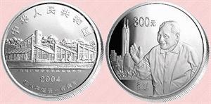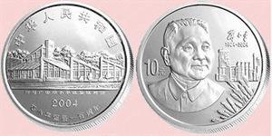[ 41 ]: [2004]07 2004年8月22日发行邓小平诞辰100周年普通纪念币、金银纪念币各一套。普通纪念币一套1枚;金银纪念币一套4枚,其中1/2盎司、5盎司金质纪念币各1枚,1盎司、1公斤银质纪念币各1枚。以上均为中华人民共和国法定货币。 普通纪念币 正面主图案为四川广安邓小平故居,内缘上方刊“中华人民共和国”国名,内缘下方刊“四川广安邓小平故居”、“壹圆”、“2004”字样;背面主图案为邓小平侧面头像,内缘上方刊“邓小平诞辰100周年”、“1904-2004”字样。币边缘刊“RMB”字样。 面额为1元,直径为25毫米,材质为钢芯镀镍,发行数量1000万枚。