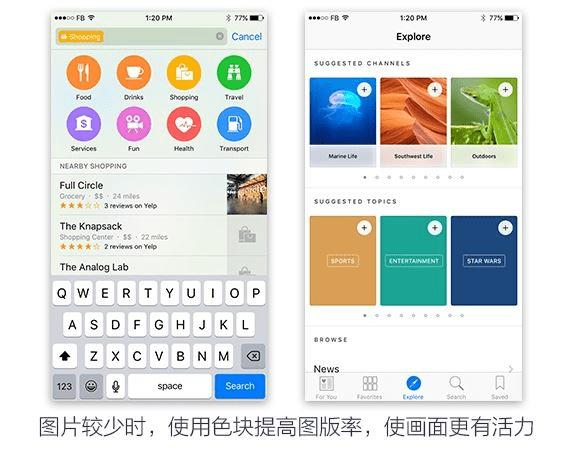 App的页面结构和文本确定之后,就要开始注意图标/按钮/图片的安排了,这时页面也就从单纯文本的“阅读”型结构调整为“观看”型结构,对于页面的易读性以及页面整体的效果会产生巨大的影响。页面中图片所占的比率叫做图版率,通常情况下降低图版率会给人一种宁静典雅、高级的感觉。提升图版率会有充满活力,使画面有富有感染力的效果。