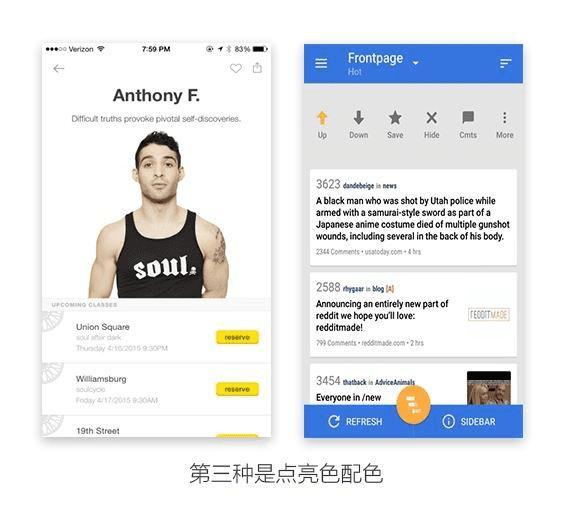第三种是点亮色配色,主色用相对沉稳的颜色,点晴色采用一个高亮的颜色,起带动页面气氛,强调重点的作用。