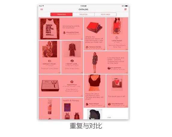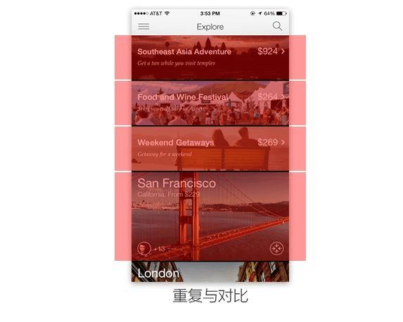 设计和做其他事情一样,也要有轻重缓急之分,不要让用户去找重点/需要注意的地方,应该让用户流畅地接收到我们想要传达的重要的信息。重复和对比是一套组合拳,让设计中的视觉元素在整个设计中重复出现既能增加条理性也可以加强统一性,降低用户认知的难度。那么在需要突出重点的时候就可以使用对比的手法,例如图片大小的不同或者颜色的不同表示强调,让用户直观地感受到最重要的信息。