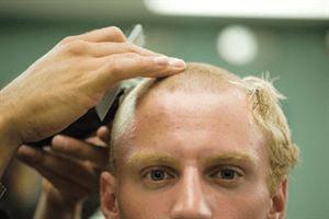 在R日,新生们不仅要换上威武的军装,还得剃光头发(女生则是盘成发髻)。