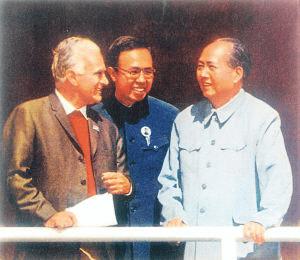 让我们翻开历史,这是1970年10月1日,毛泽东在**城楼上会见斯诺。中间这位就是翻译冀朝铸(中)。