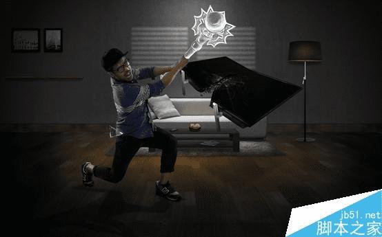 4:接下来就是结合模特的动作开始手绘元素(因为创意脚本有手绘的结合)先简单的把武器和电视的构图画出来,位置透视都差不多了,就可以根据构图来拍摄电视机素材。(电视机在模特动作确定后再拍摄。这样的话,电视机的角度和透视与模特的动作不会有太大的透视不和谐的问题)