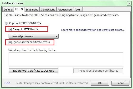 选中"Decrpt HTTPS traffic", Fiddler就可以截获HTTPS请求