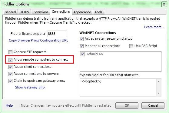 配置Fiddler, 允许"远程连接"