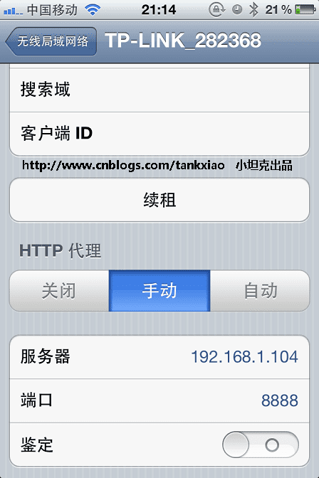 打开IPhone, 找到你的网络连接, 打开HTTP代理, 输入Fiddler所在机器的IP地址(比如:192.168.1.104) 以及Fiddler的端口号8888