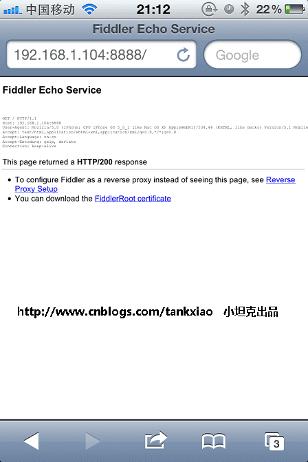 2. 打开IPhone 的Safari, 访问 http://192.168.1.104:8888, 点"FiddlerRoot certificate" 然后安装证书