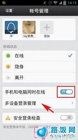 2、在账号管理界面有个“手机和电脑相同在线”的设置,在这里你可以按需开关相同在线功能。相同,开关下面有个“多设备登陆管理”,在这里你可以查看该QQ目前在几个设备上登陆,还可以对电脑上的QQ进行下线。