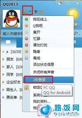 3、手机上可以设置,那么在电脑上同样可以设置。在电脑QQ界面点击“在线状态菜单”,该QQ有几处登录,那么菜单上就会显示有几处登陆,点击会跳出“多处登录管理界面”,在这里你可以对手机上的QQ进行下线。