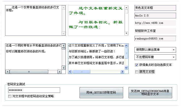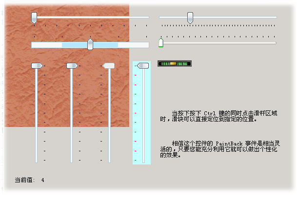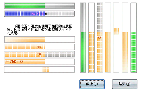 除上述改变外,对旧版本功能上的完善也是新版的工作之一,如:所有皮肤图像都不再限制尺寸、进度条实现了垂直显示及显示不同格式的进度文本、列表框的多选及复选等等。