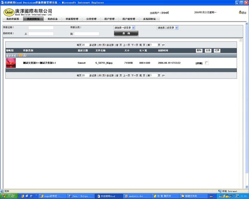实现用户对图片的浏览、上传、删除等操作,图片的显示可以分为:列表显示、缩略图显示、幻灯片显示,同时能详细显示某个图片的详细描述,上传时间,规格、大孝上传人等。系统管理员可以设置系统用户组,超级用户: 拥有所有功能添加, 删除, 修改 和浏览所有目录,受限用户: a. 可添加文件, 浏览指定目录b. 只可浏览指定目录文件,系统管理员可以对图片进行分类存储:A) 可以按日期分(09/07/2006);B) 可以按类型分(类型有: a) 电脑袋 b) 旅行包 c) 行李包 d) 公文包 e),创建目录名,同时指定该目录所属用户组。可以对图片文件按要求进行搜索:A) 可以按名称搜索 B) 可以按分类搜索 C) 搜索某时间段产品 ..... 搜索出来的产品可以以缩略图显示 D) 按用户搜索,搜索后显示该用户的所有图片
