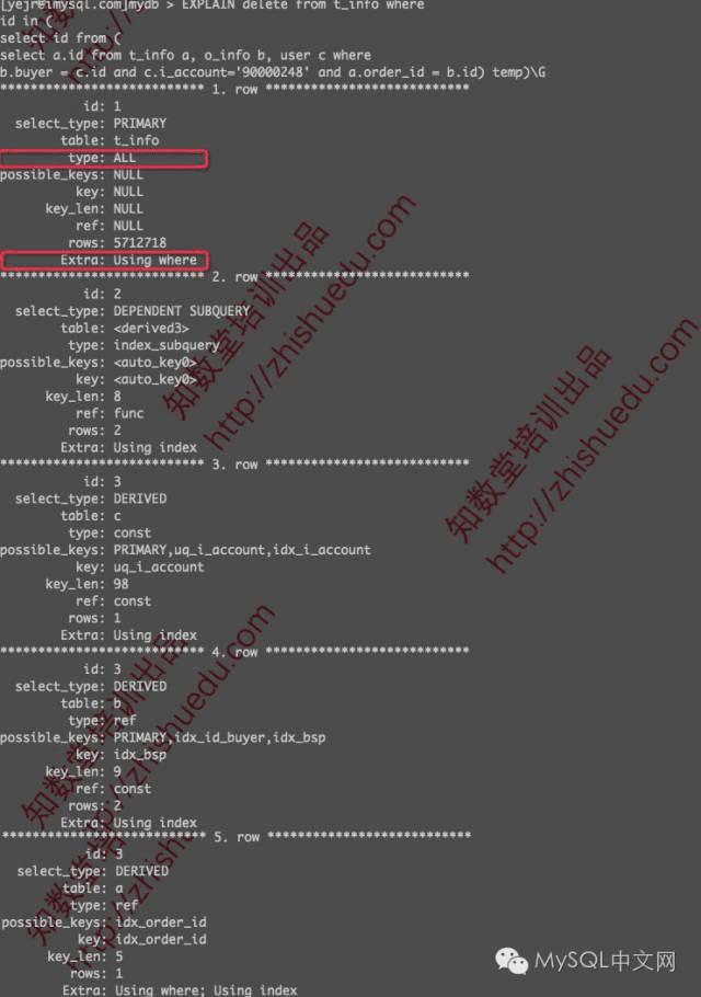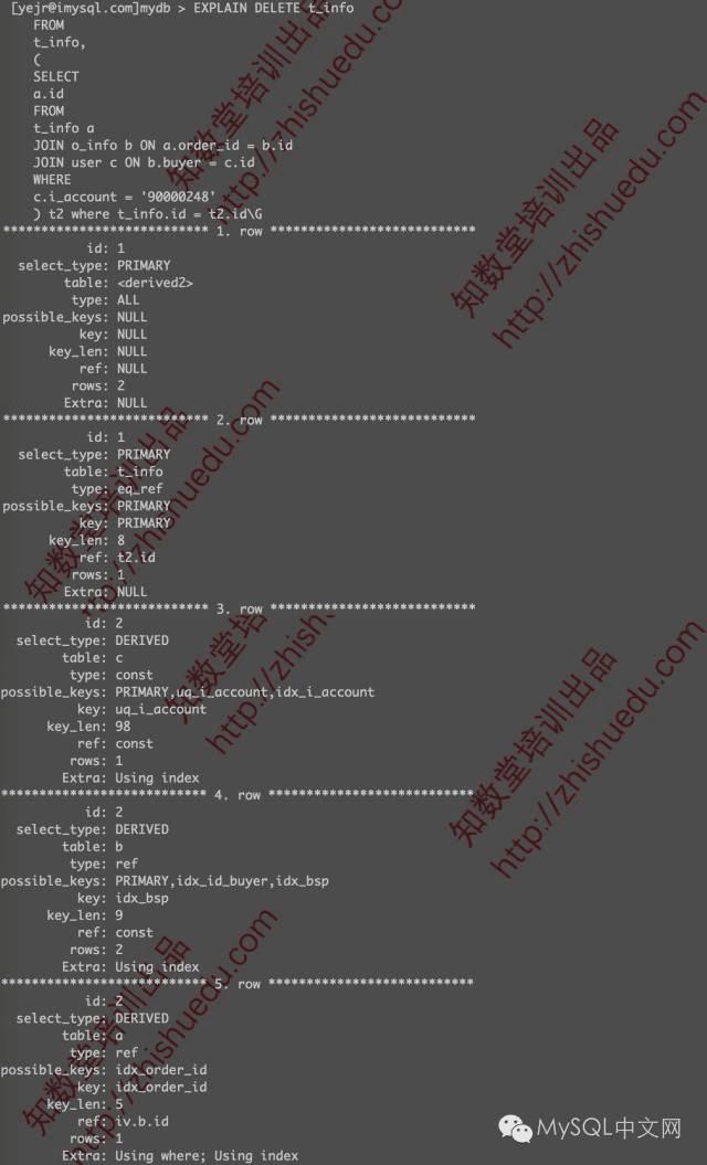 [yejr@imysql.com]mydb > EXPLAIN delete from trade_info where id in ( select id from ( select a.id from trade_info a, order_info b, user c where b.buyer = c.id and c.itv_account='90000248′ and a.order_id = b.id) temp)\G