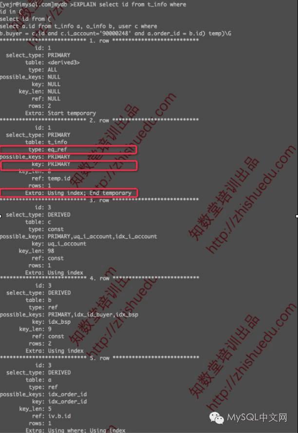 [yejr@imysql.com]mydb >EXPLAIN select id from trade_info where id in ( select id from ( select a.id from trade_info a, order_info b, user c where b.buyer = c.id and c.itv_account='90000248′ and a.order_id = b.id) temp)\G
