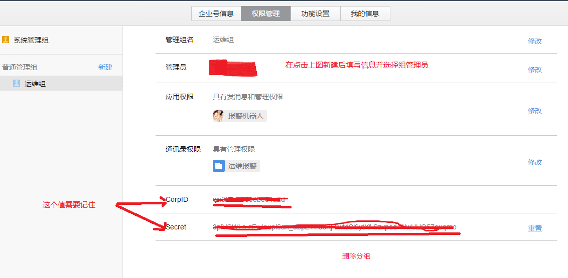 其中代码114、115行中的CropID 和 Secret对应的是第四步《设置权限管理》中图三对应的CropID 和 Secret