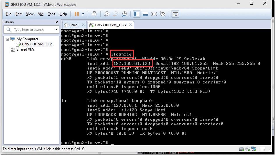 如下图所示,运行ifconfig获取IOU Unix系统的网卡IP配置信息,从下图可以知道该IOU Unix虚机的IP为192.168.61.128,记住该IP地址,后面在配置GNS3 IOU的时候需要用到。