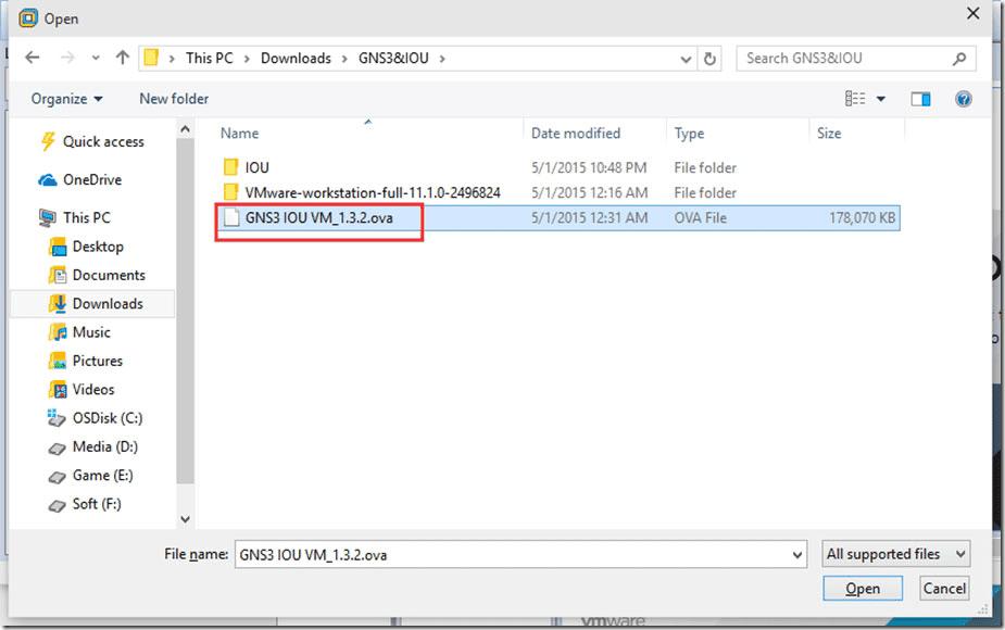 选择下载好的虚拟机模板-GNS3 IOU VM_1.3.2.ova