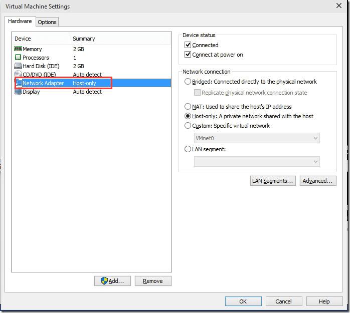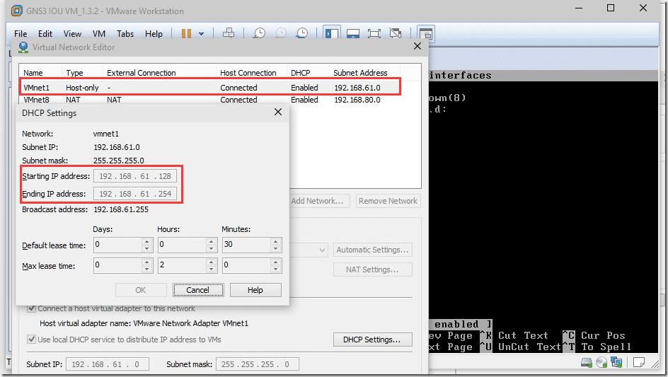 通过,查看VMware上的”Host-Only”网络配置,确认IOU虚拟机的IP地址就是从”VMnet1”的DHCP服务器得到的第一个IP地址-192.168.61.128。