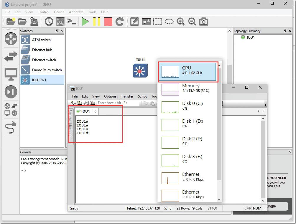 如下图所示,双击IOU1设备即可进入控制台配置界面: