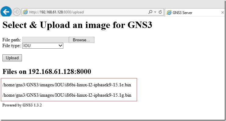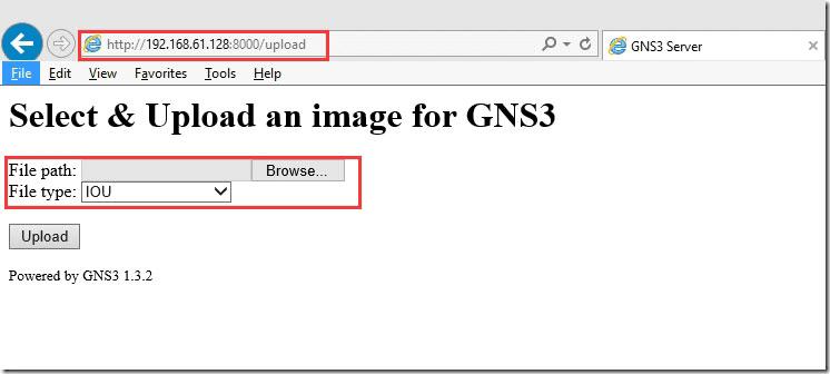 在物理机上打开浏览器,输入IOU Unix虚拟机的IP地址,打开IOU镜像上传界面,如下图所示: