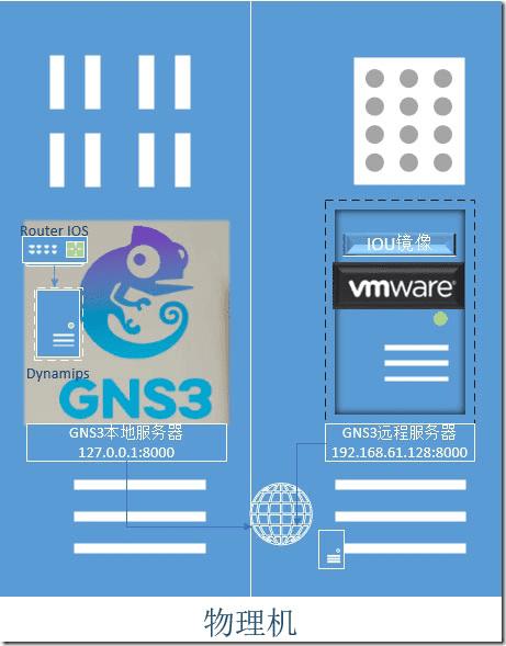 IOU的运行环境如上图所示:IOS运行在Dynamips模拟的GNS3本地服务器中,GNS3以C/S的web模式通过127.0.0.1:8000访问运行在物理机上的GNS3本地服务器;IOU镜像运行在GNS3称为远程服务器的VMware虚拟机Unix系统中,GNS3以C/S的web模式通过192.168.61.128:8000和VMware上的Unix系统通信。
