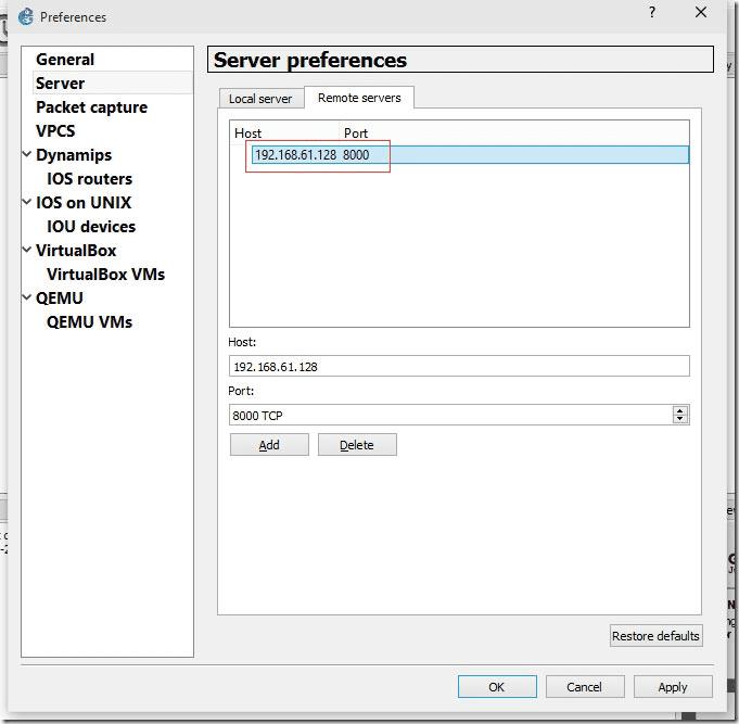 GNS3的配置如下图所示,在“Remote servers”里添加IOU Unix虚拟机的IP地址实现GNS3和IOU虚拟机的通讯!