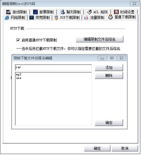 对WEB访问中的下载或打开的文件类型可以进行限制,你可以限制所有的HTTP下载和FTP下载。限制HTTP下载时可以输入文件后缀名以限制相应格式的文件下载,也可以选择“严格禁止HTTP下载”从而禁止一切HTTP下载;而限制FTP下载,你既可以输入文件后缀名来进行限制。
