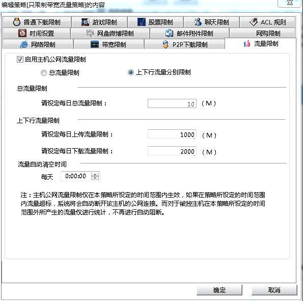 我们提供了多方面的带宽流量优化手段,除了上面介绍的带宽控制外,还可以设置每天总的上行、下行或总的流量,当一台主机访问外部网络的流量超过设定流量时自动断开其与外部网络的连接。总流量限制方法尤其适合需要计费的情况。结合带宽分配的方法可以适应一个组织的各种特殊需要。如下图所示: