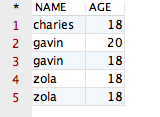 假设有一个表“CESHIDEMO”,包含两个字段,分别 NAME 和 AGE,具体格式如下: