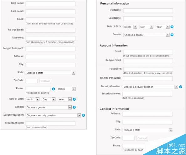 把信息分成相应的组可以使它更清晰且具有可读性。在右边的表格,把 15 个领域分为三组,使过程更容易。内容的量是一样的,但对用户的影响却大不相同。