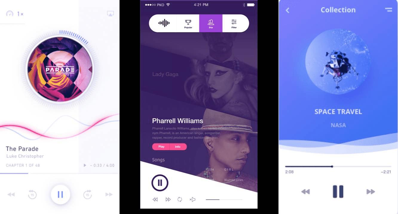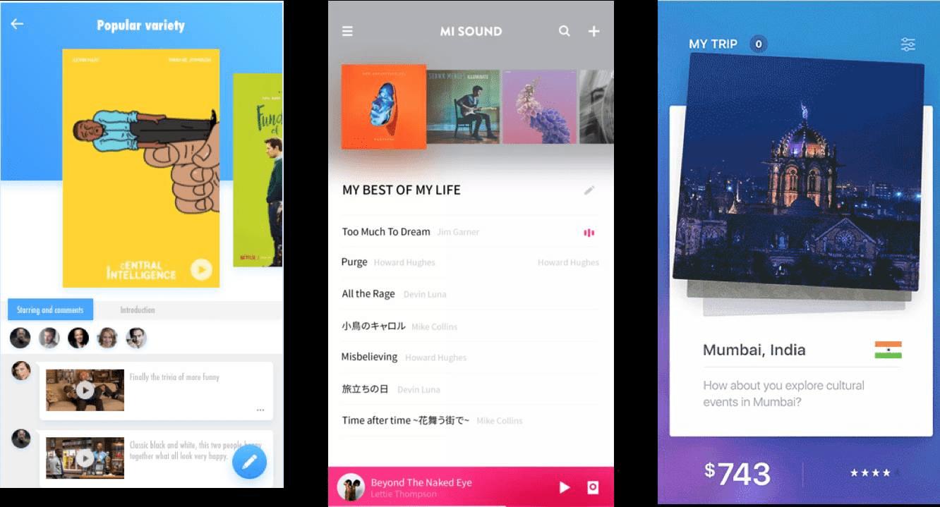 简析:图1在书籍封面上采用封面和背景,和消息留这种视觉错差营造布局空间感,图2,大的专辑封面长图和背景很好的融合,图3,卡片滑动时候的层叠效果。