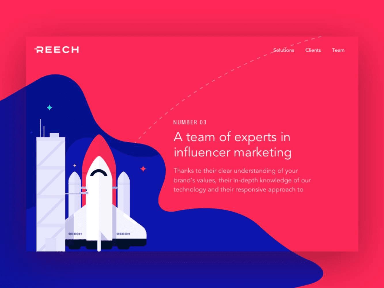 简析:REECH在页面设计时候运用对角线作为深色,同时结合流动的线条凸显主营业务和速度感。