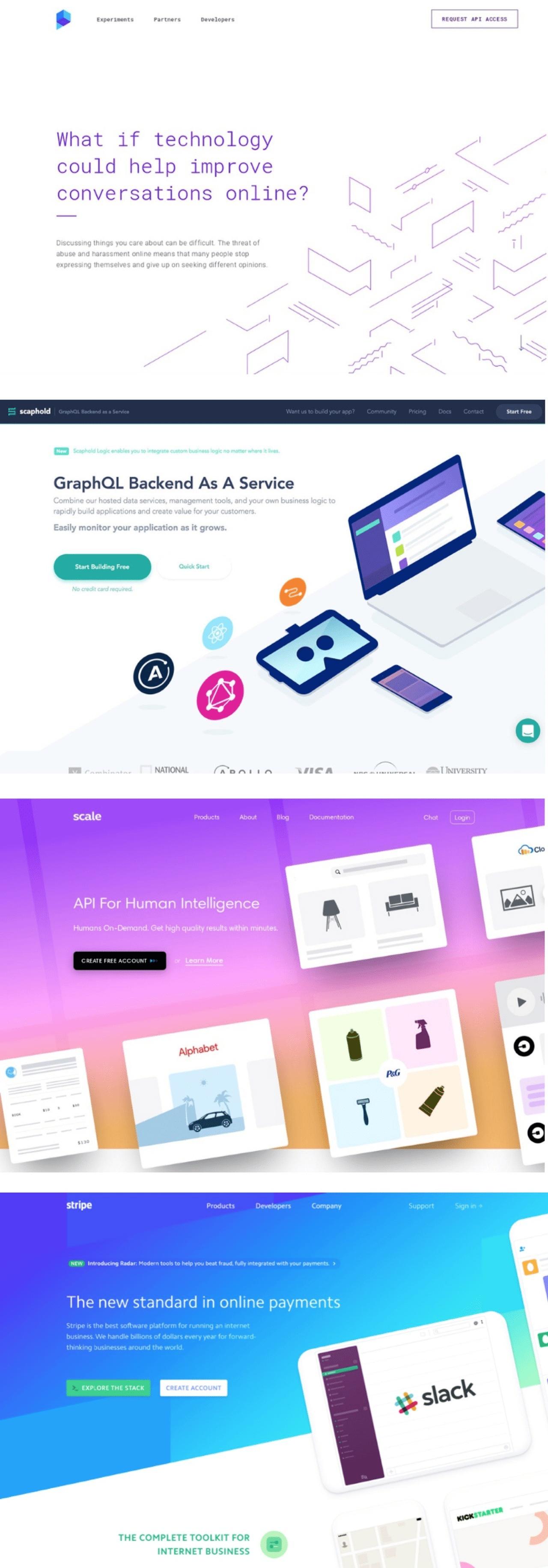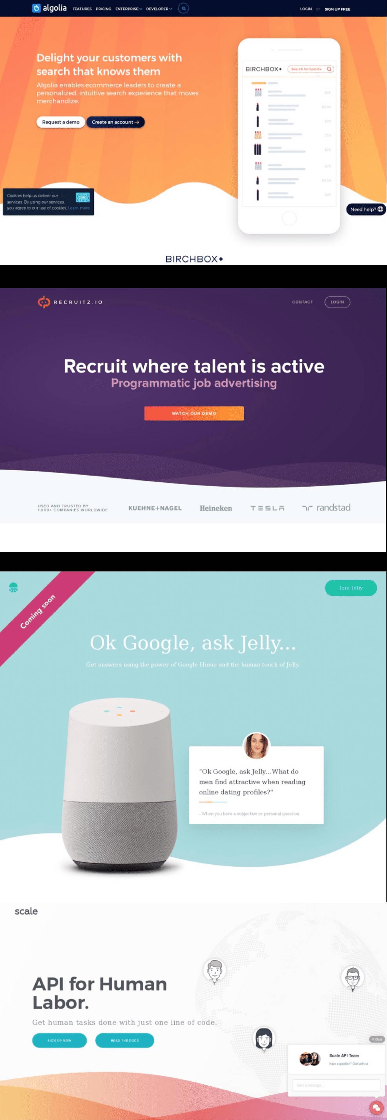17年在很多新的设计趋势里面有种风格,一般常在页面头部才用不规则弧线几何图形的形式作为头部主视觉,区别于传统长方形,形成设计差异性,同时在不规则弧线处理上常用和头图或者插画进行结合,有时候也会采用线条形式出现。