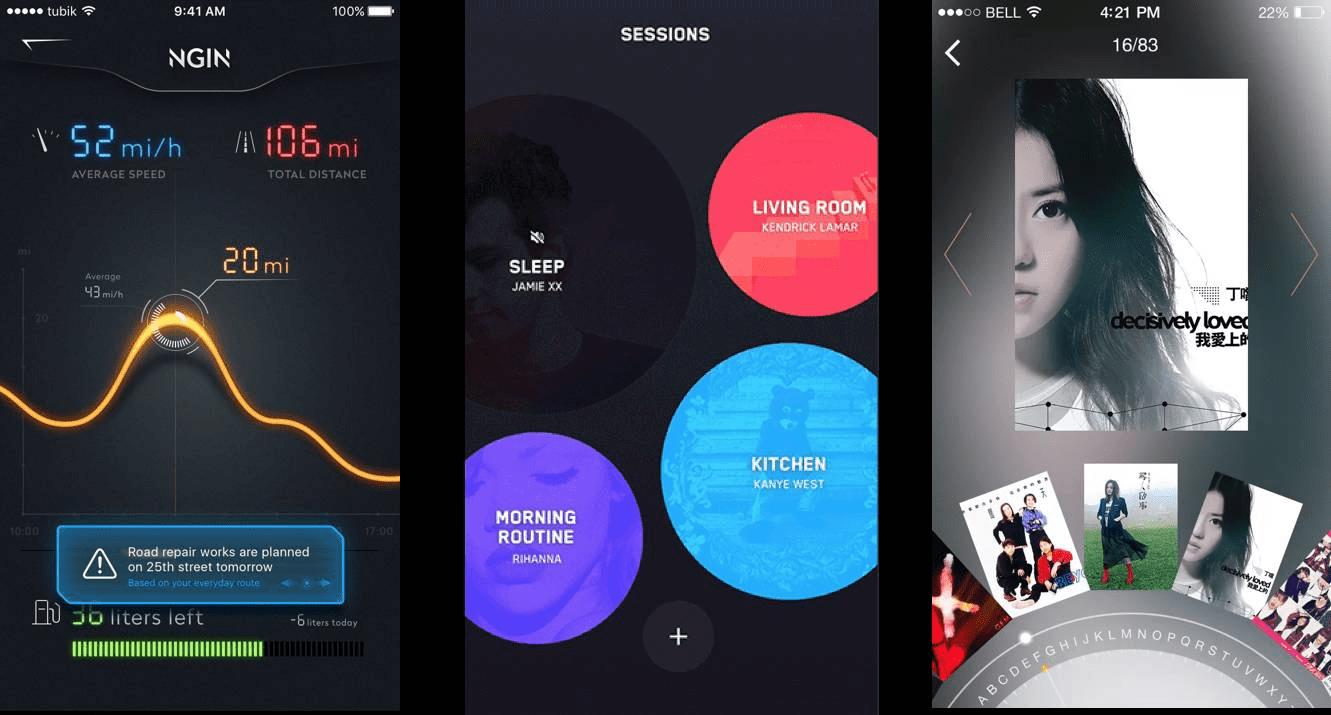 图1,顶部导航运用车的流动线条h,返回按钮用的车灯形状,符合产品定位和气质,图2,主导航采用4个流动的气泡,图3,选择歌曲运用圆盘设计,新颖。