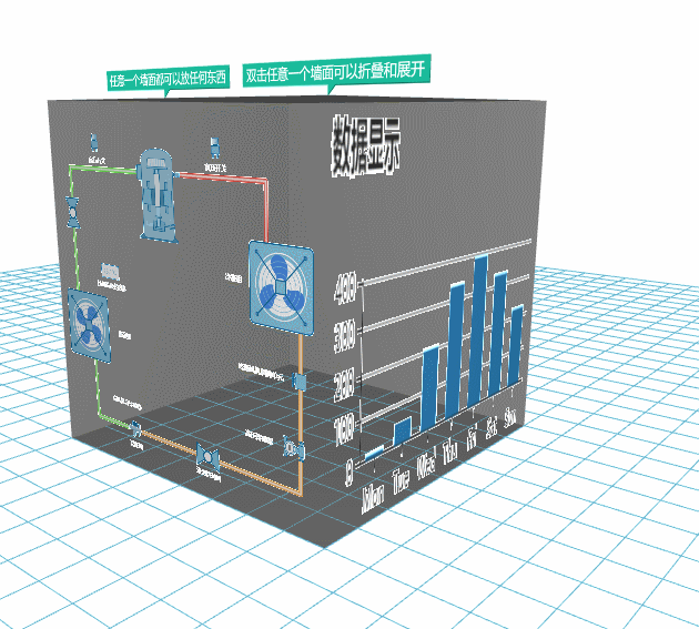 这个时候我不能把pumpGV和g3d都加到底层div上,并且我的意图是把pumpGV加到g3d中的CSGBox中的一面上,所以为了让pumpGV显示出来 必须设置pumpGV的宽高,而这个宽高必须比我json画出来的图占的面积要大,不然显示不完整。如果想看这个宽高对显示的影响,可以自己改改看来玩玩。